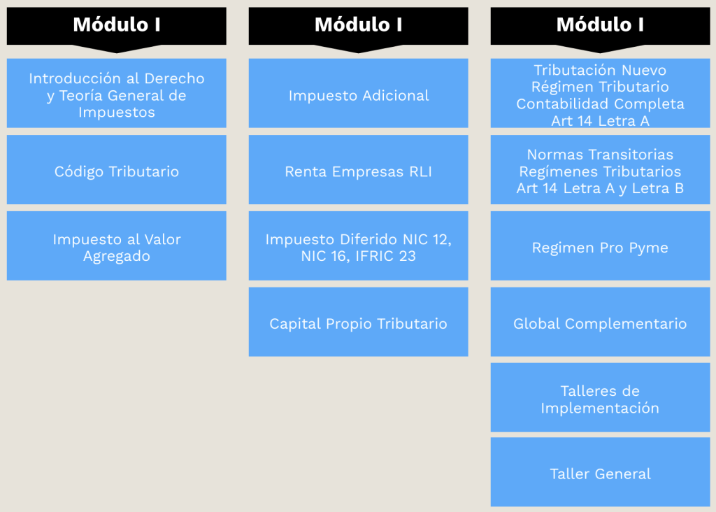 • Proporcionar herramientas que permitan a los alumnos actualizar sus conocimientos tributarios respecto a las modificaciones por cada Reforma Tributaria a la normativa vigente y así enfrentar los nuevos desafíos.